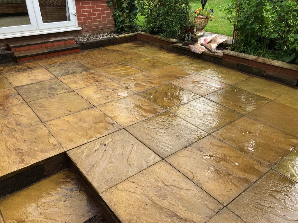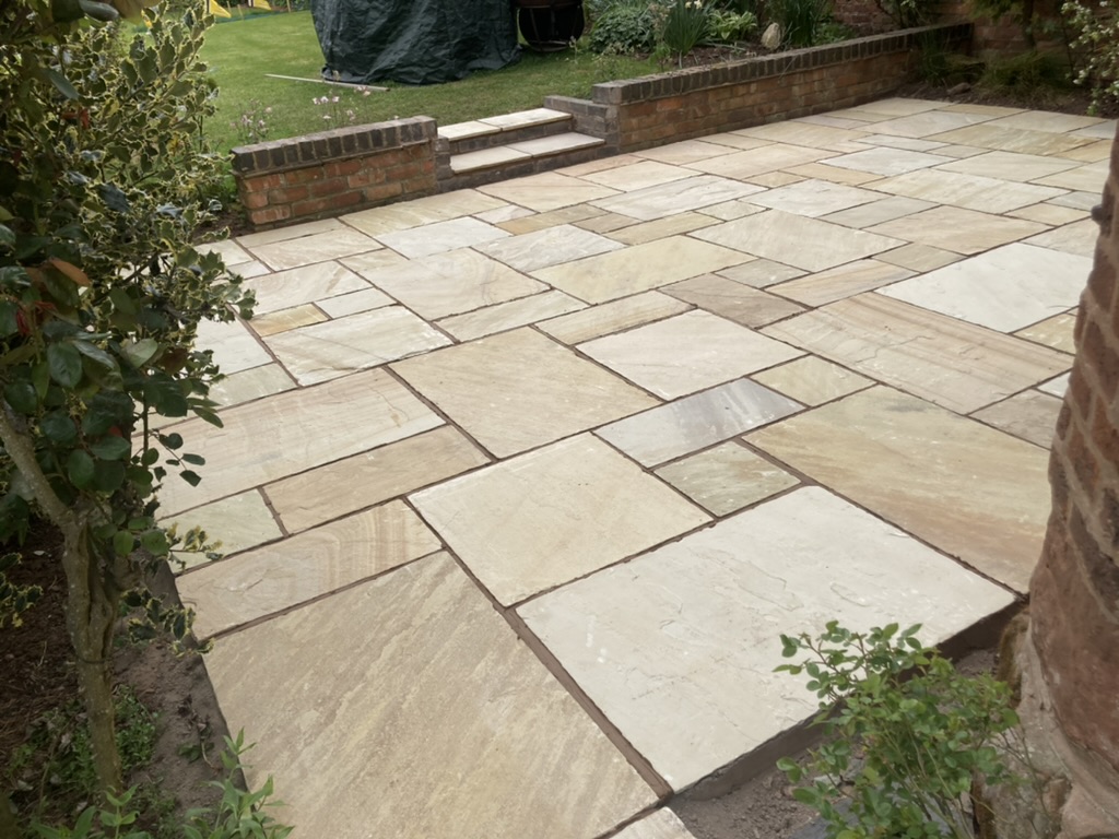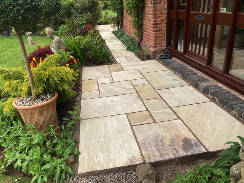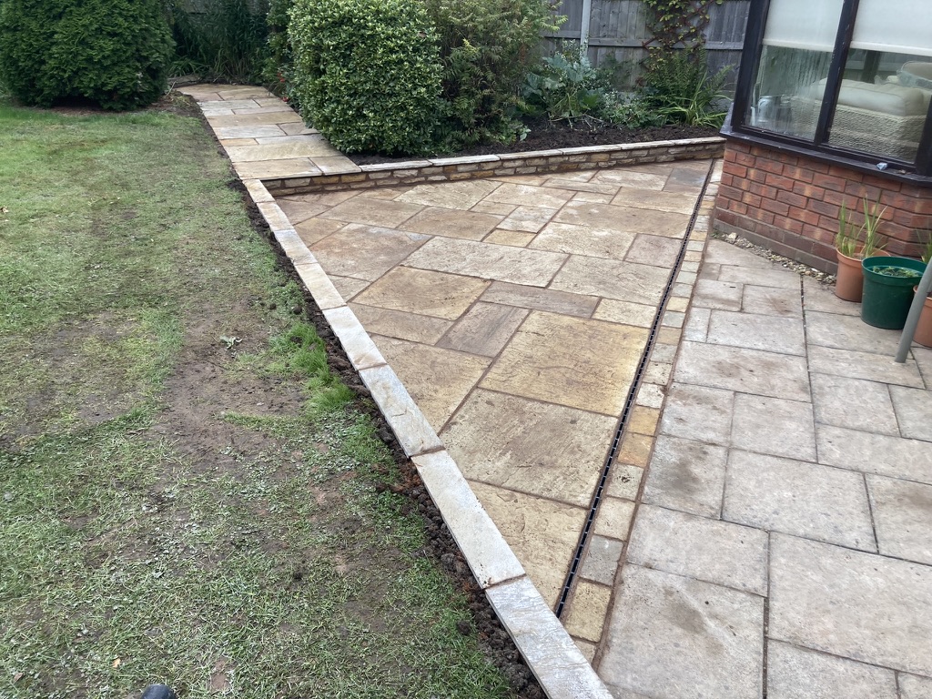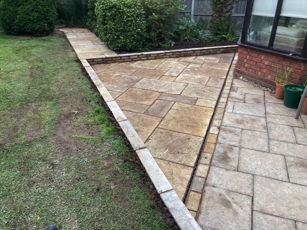 A patio extension, step and path using a rustic Indian sandstone. Sandstone setts were used as bricks for the small retaining wall to enhance the rustic feel requested by the customer. Discrete drainage was created using a slot drain leading to a soakaway.