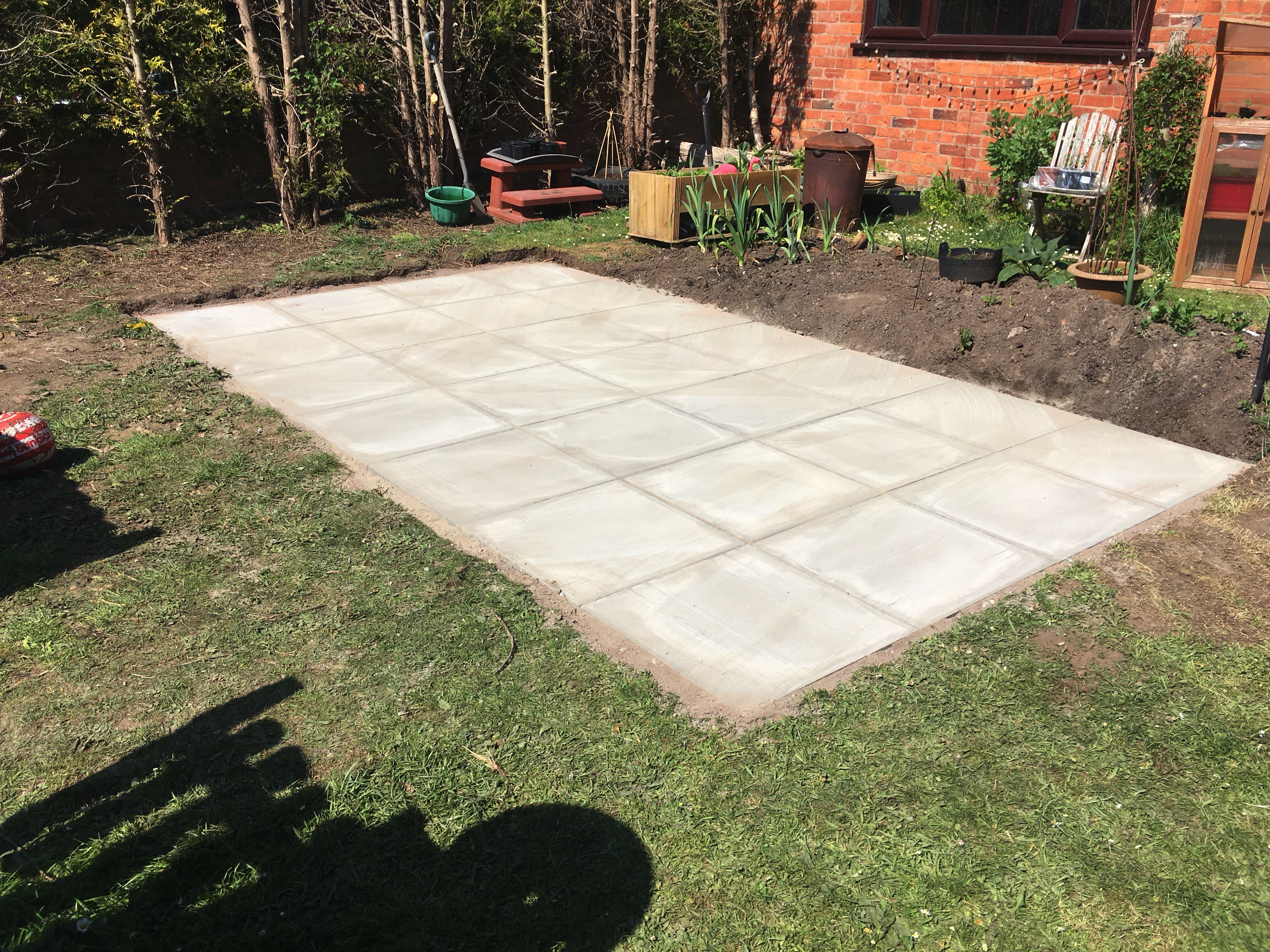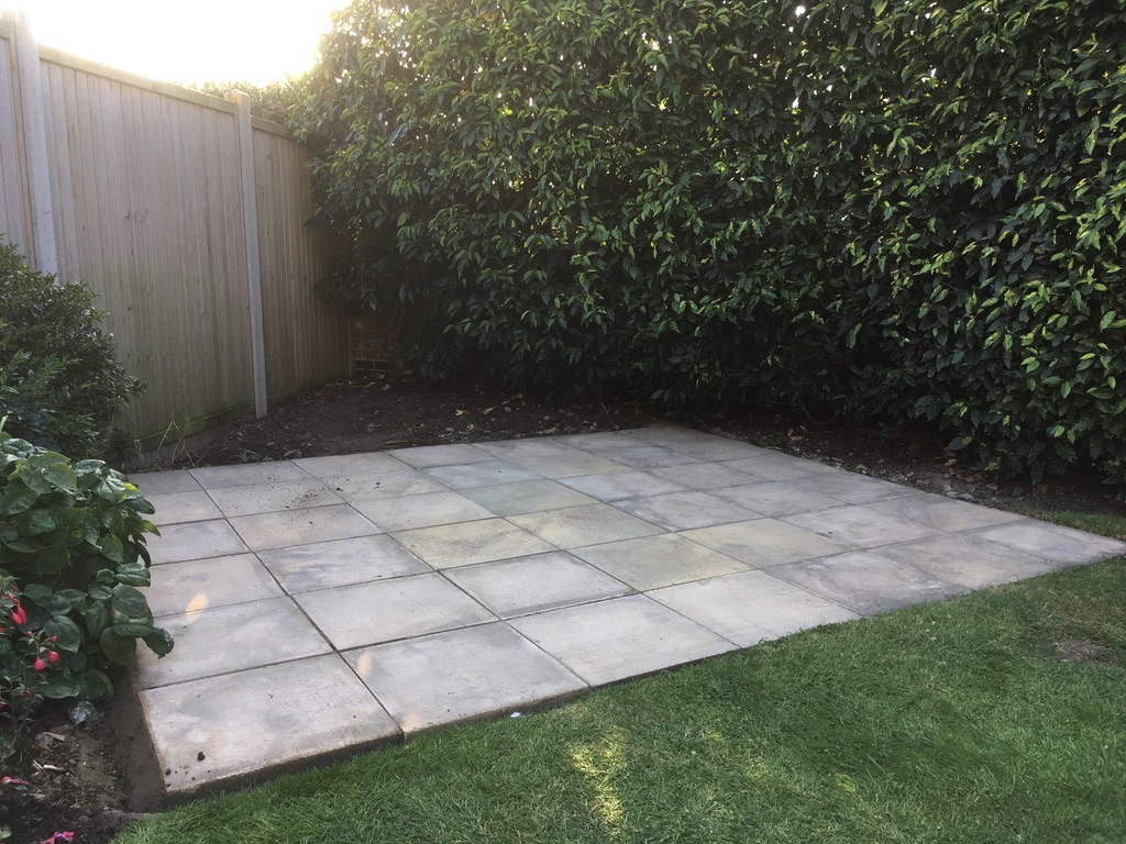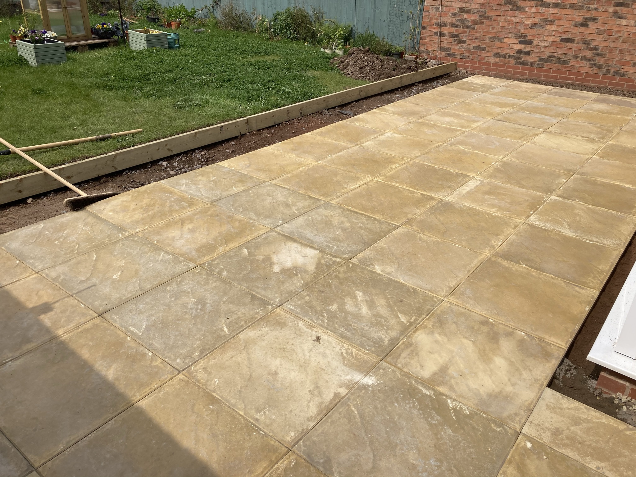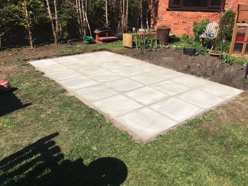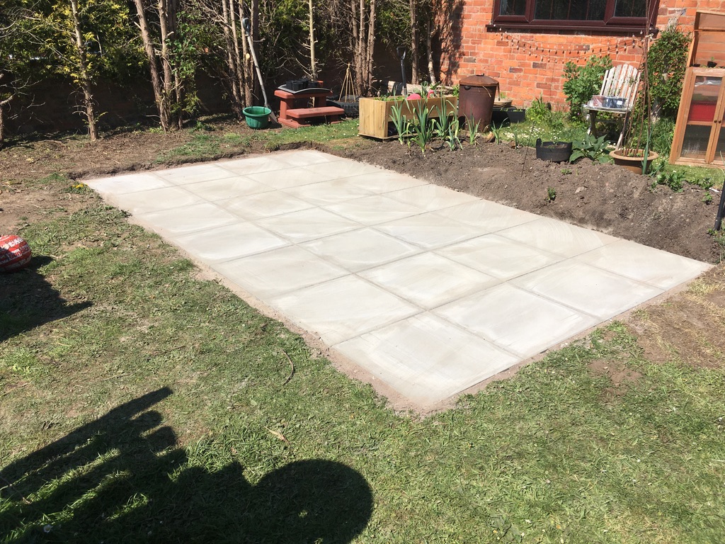 A patio extension, mixing new and existing slabs to create a more uniform pattern.