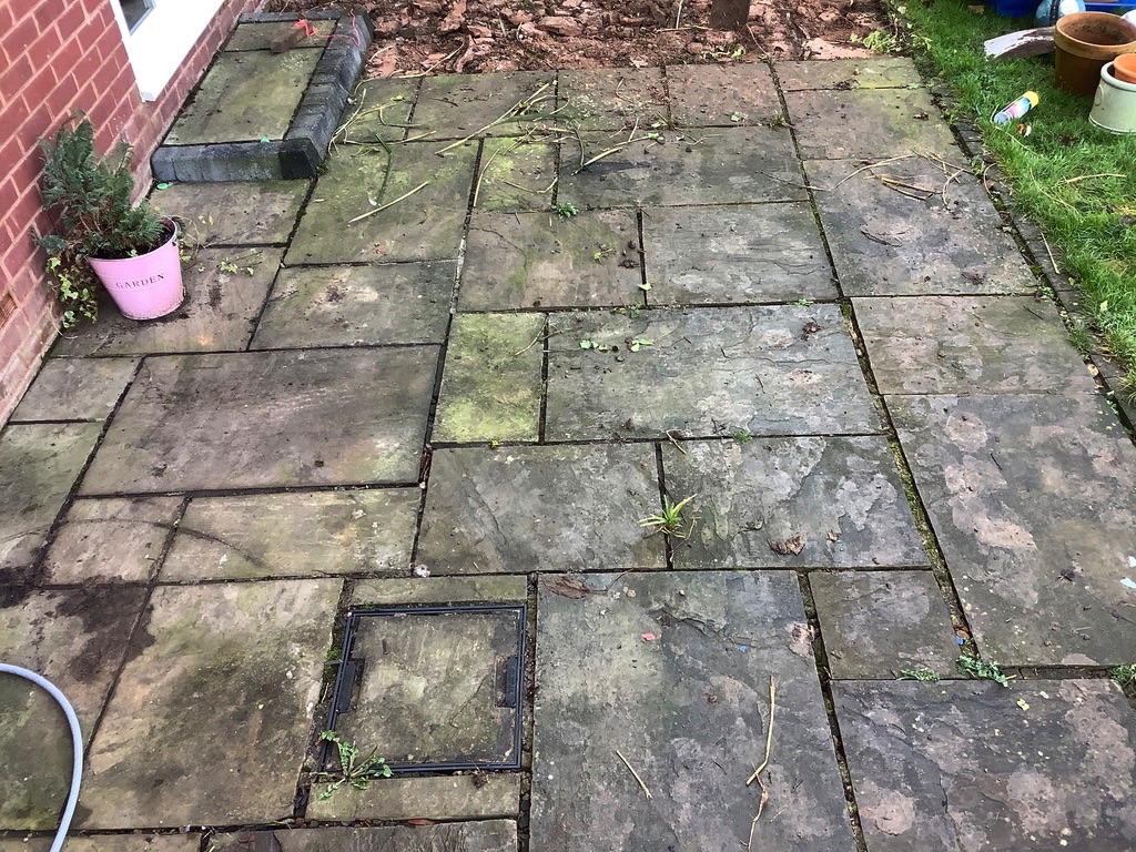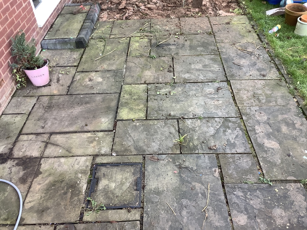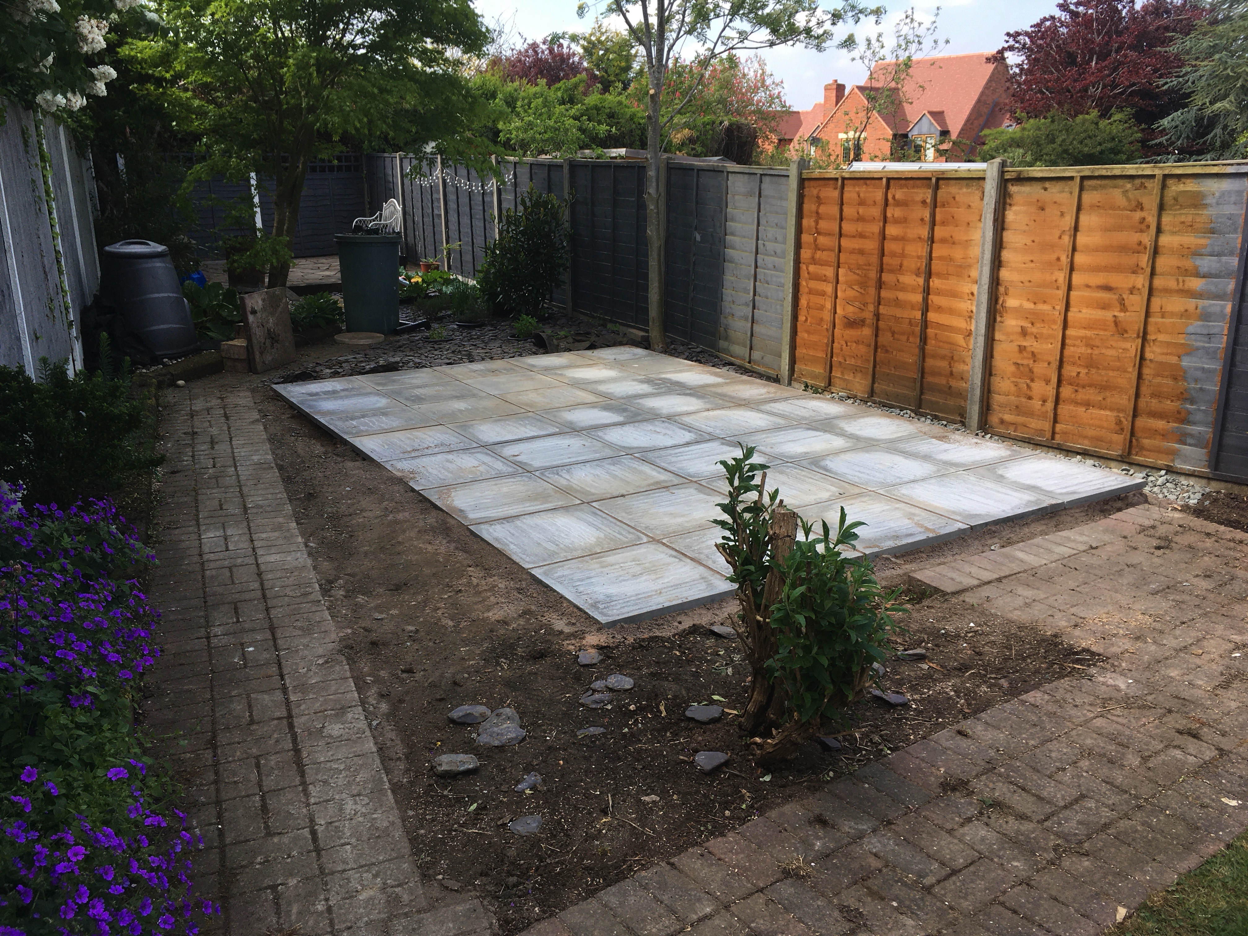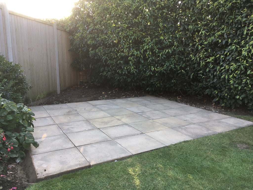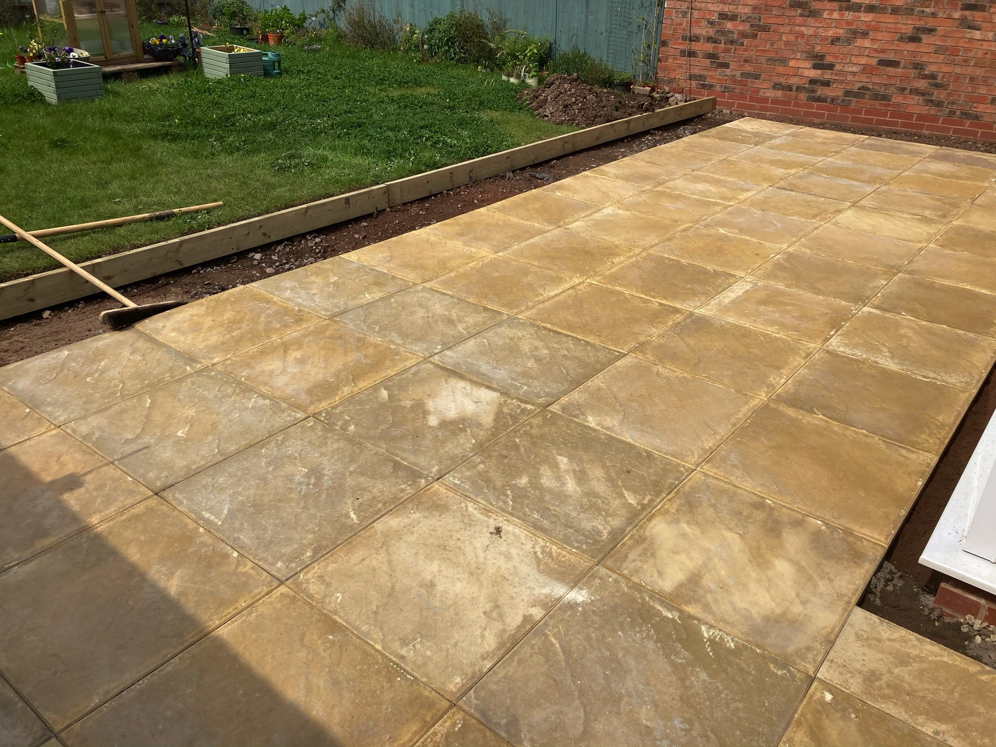 A patio extension, mixing new and existing slabs to create a more uniform pattern.