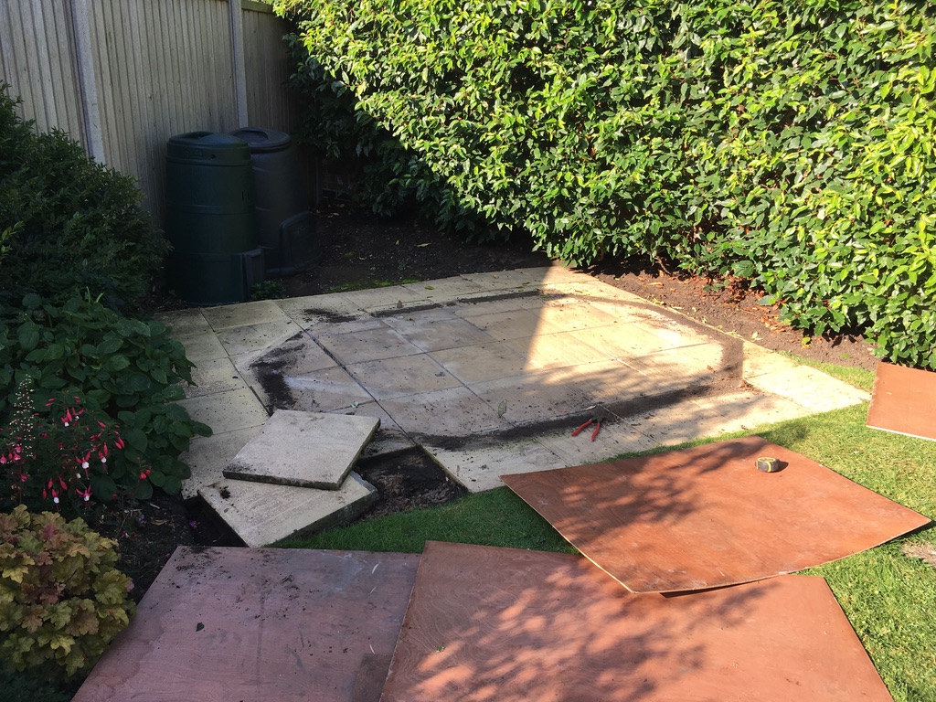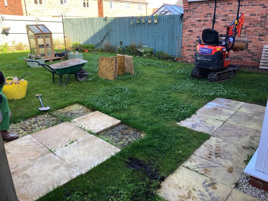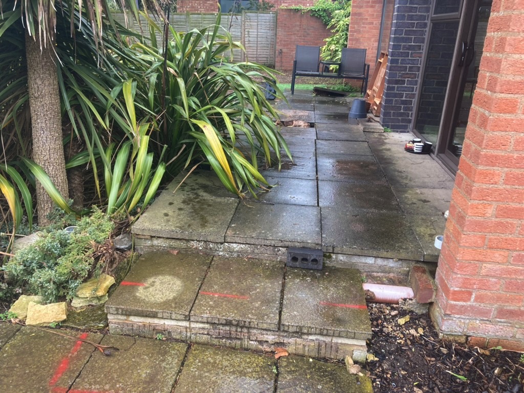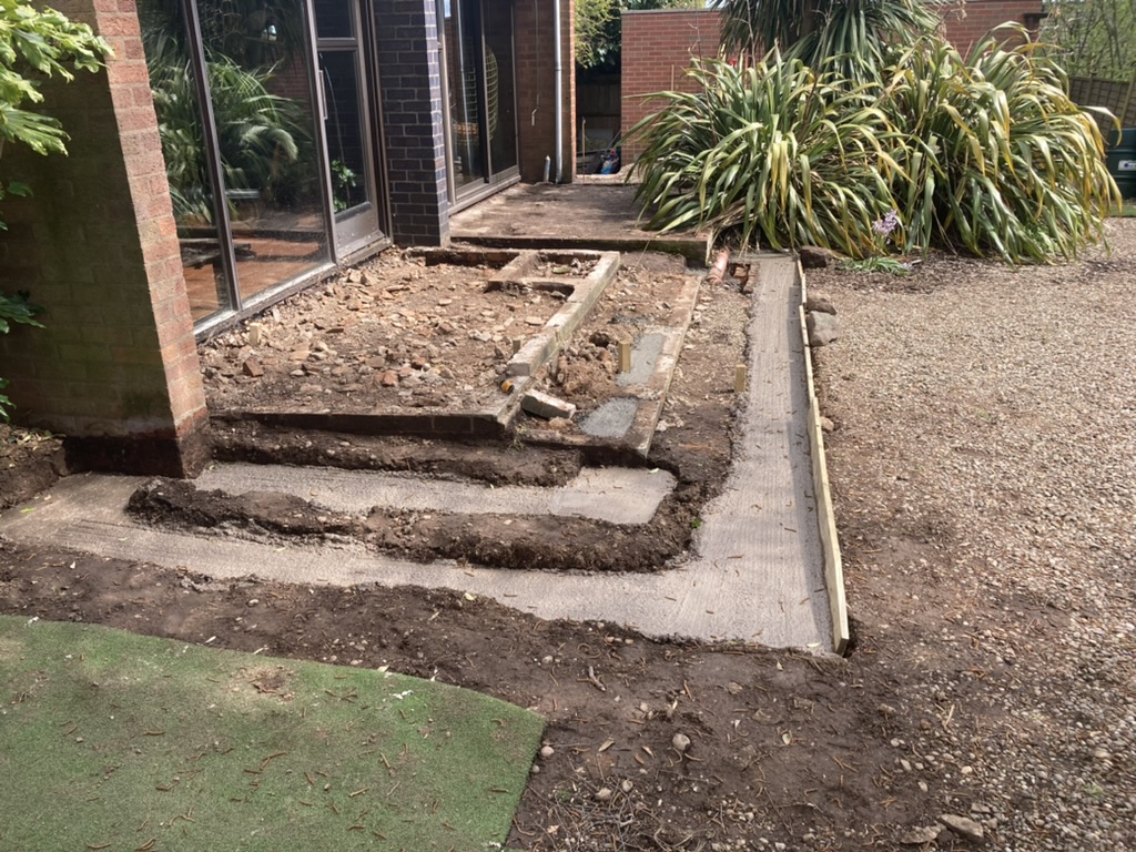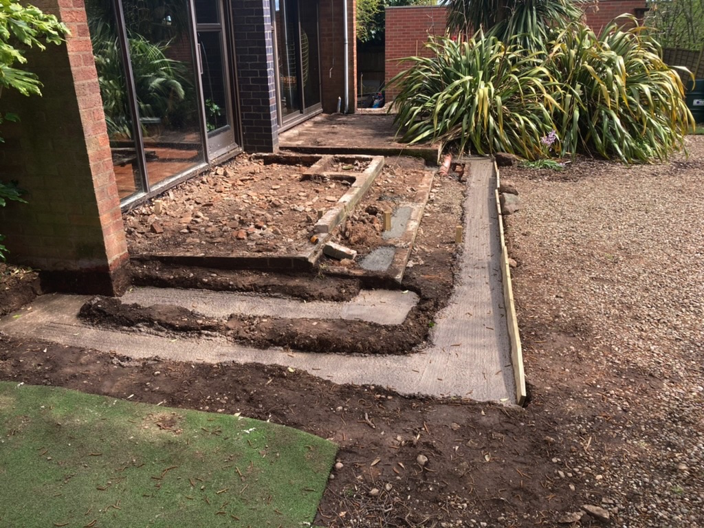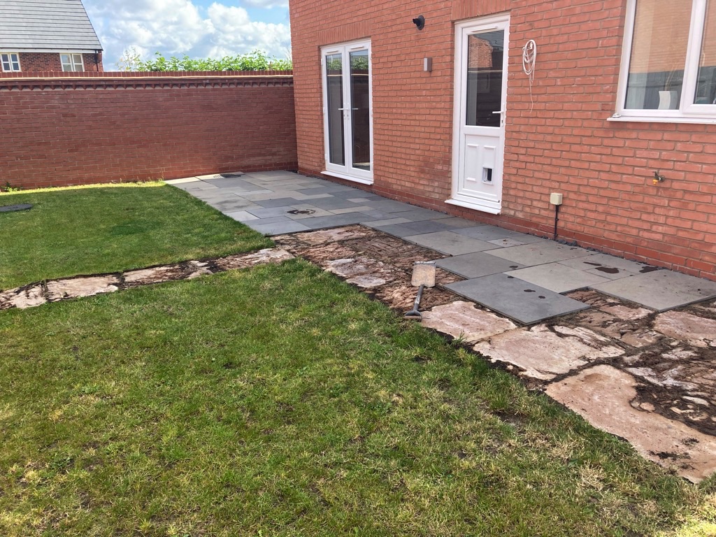 Re-laying & extending a patio that had been previously poorly constructed, with no correct use of sub-base materials, leading to uneven and moving slabs.