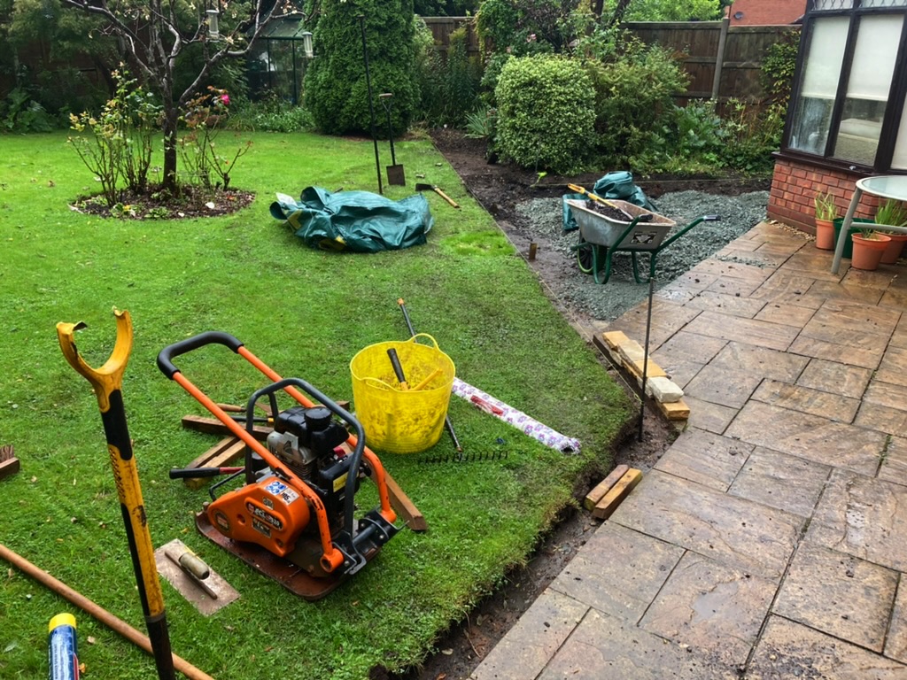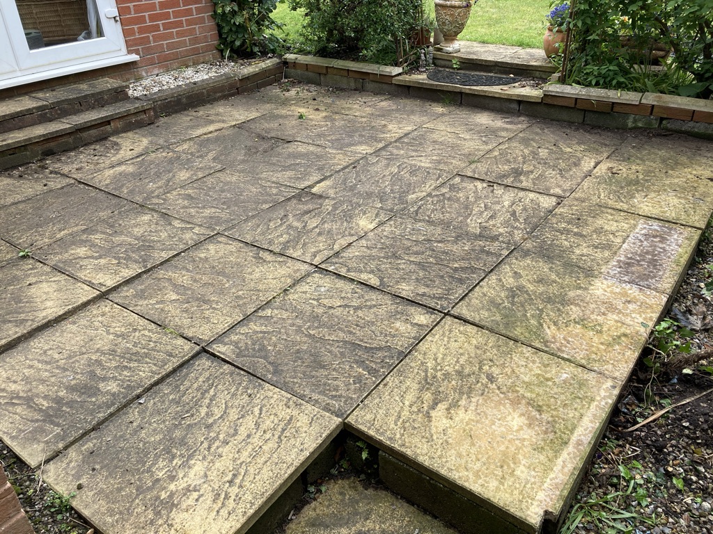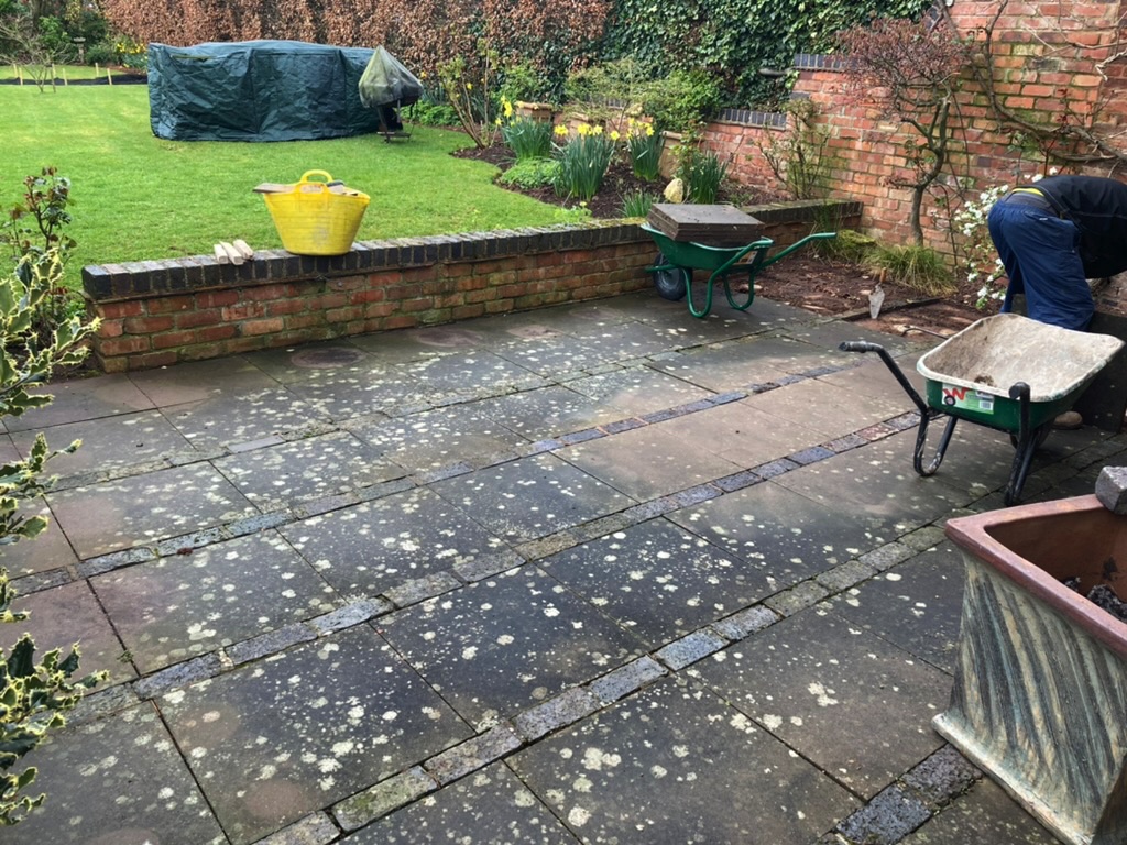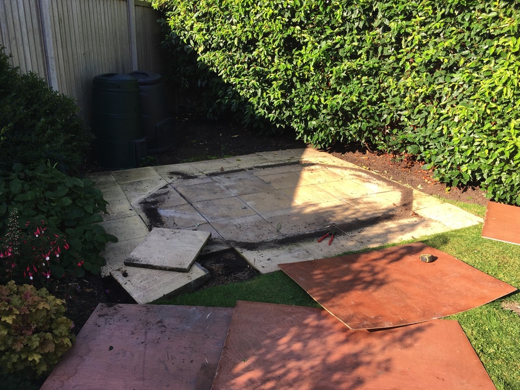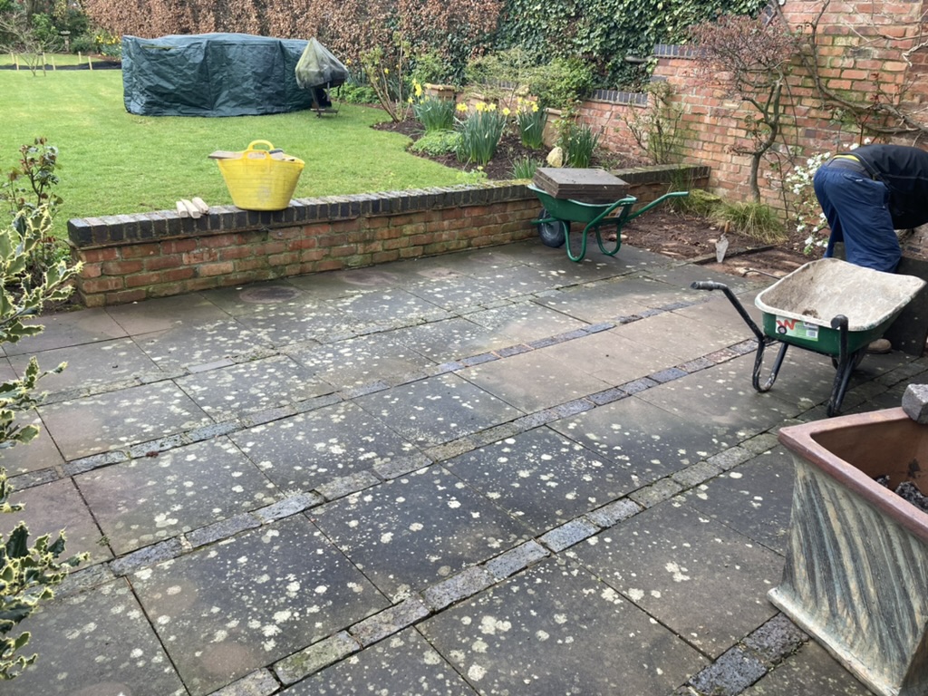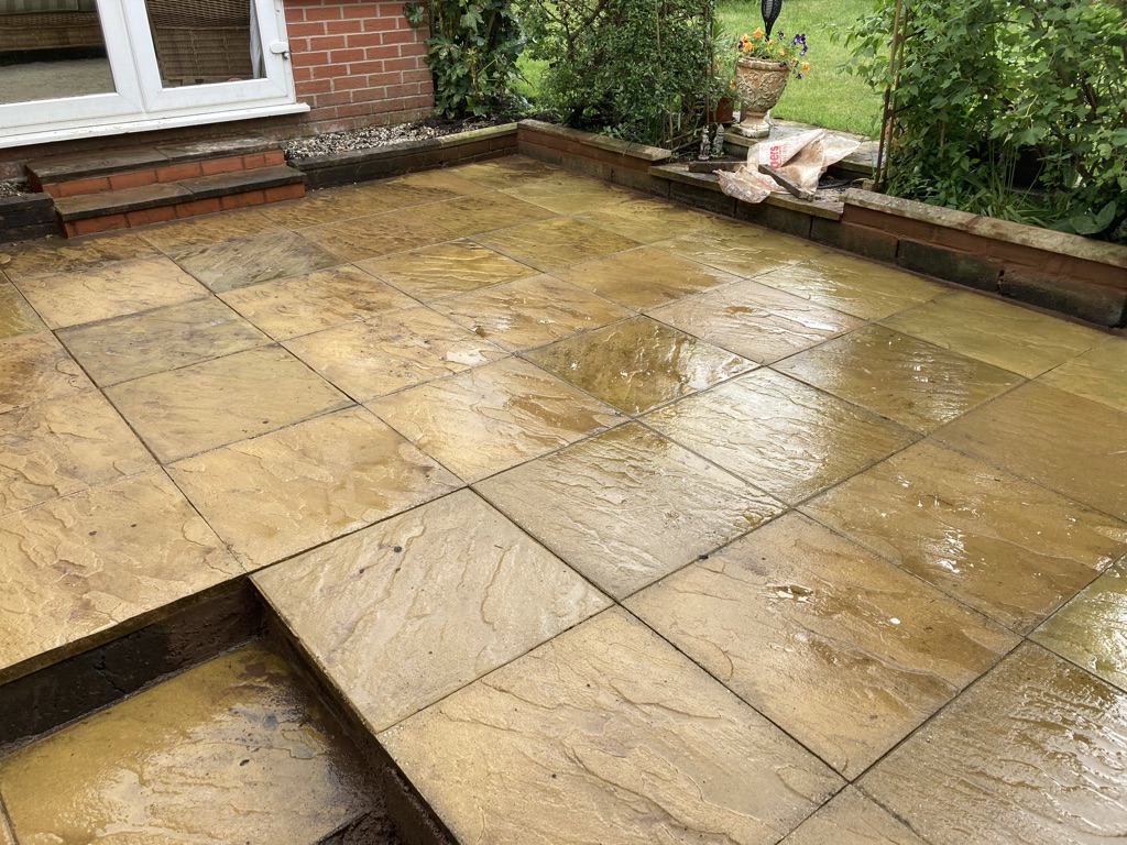 Re-laying & extending a patio that had been previously poorly constructed, with no correct use of sub-base materials, leading to uneven and moving slabs.
