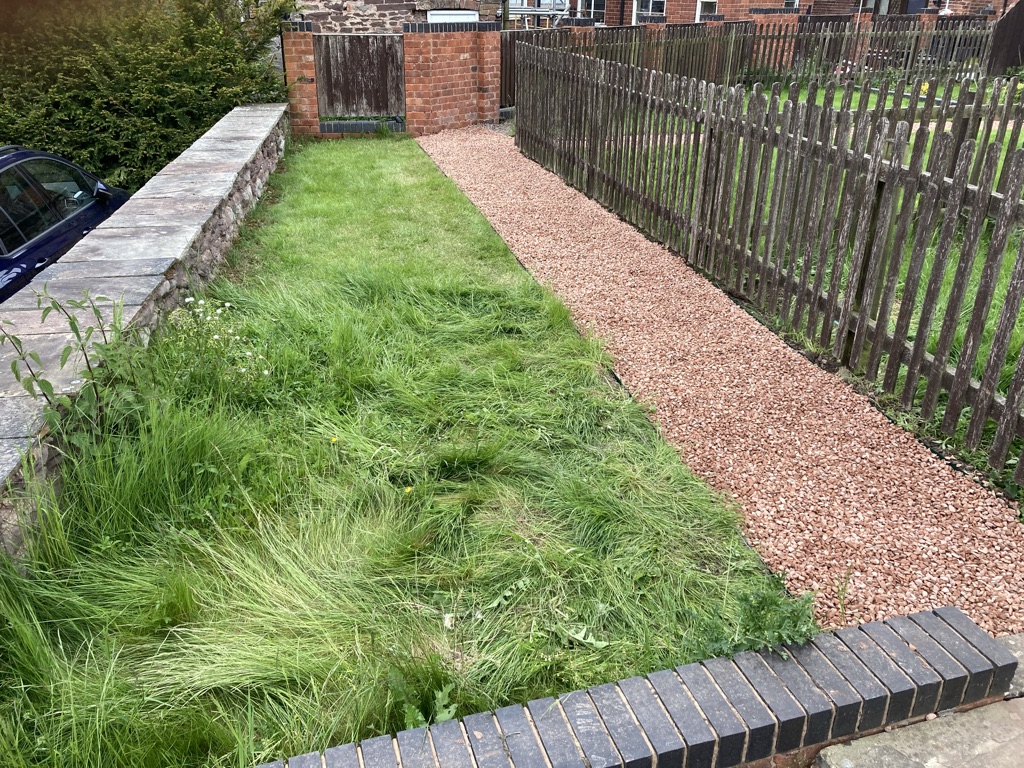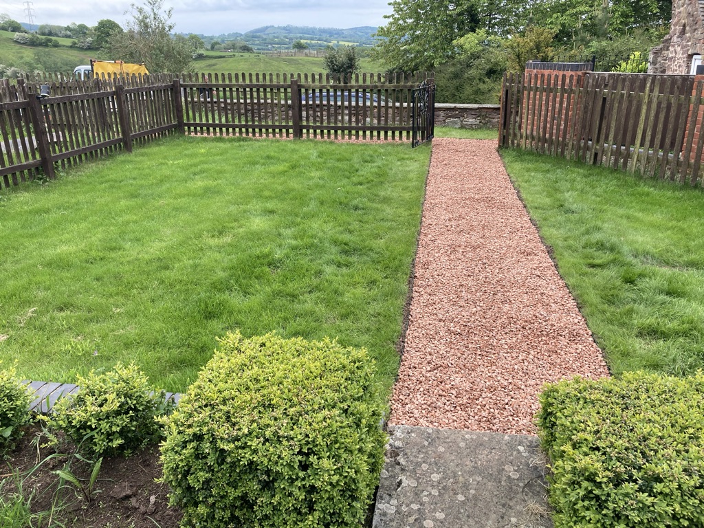 Two simple gravel paths dug across the lawn, steel edging used for the sides with a membrane & gravel in-fill