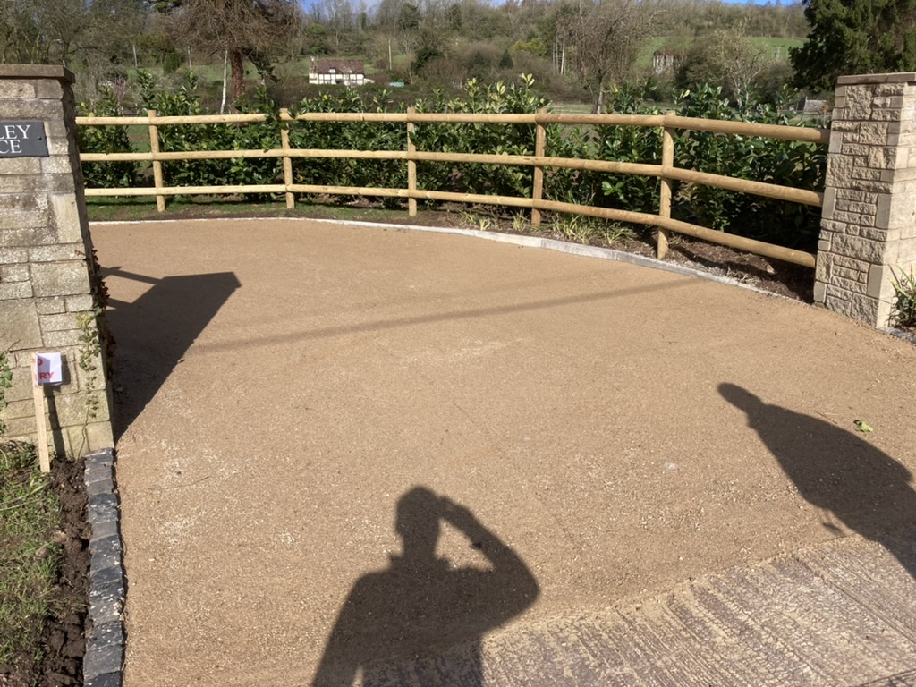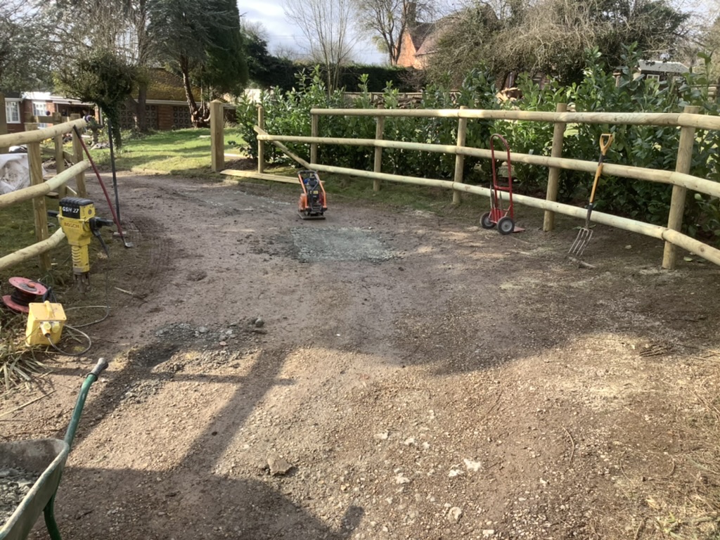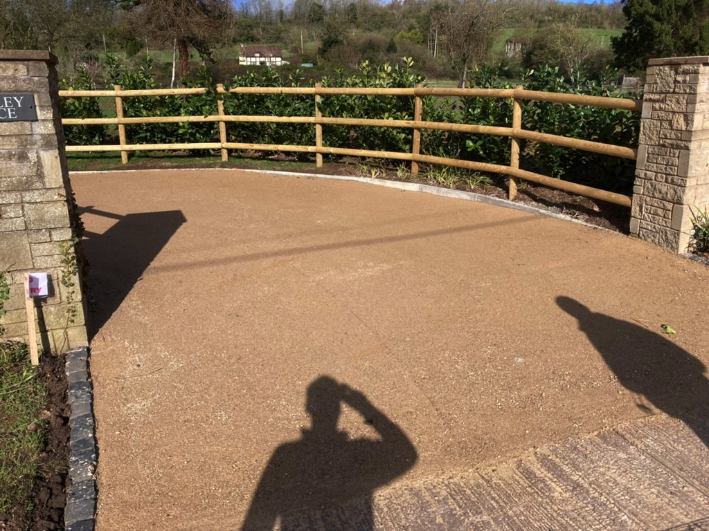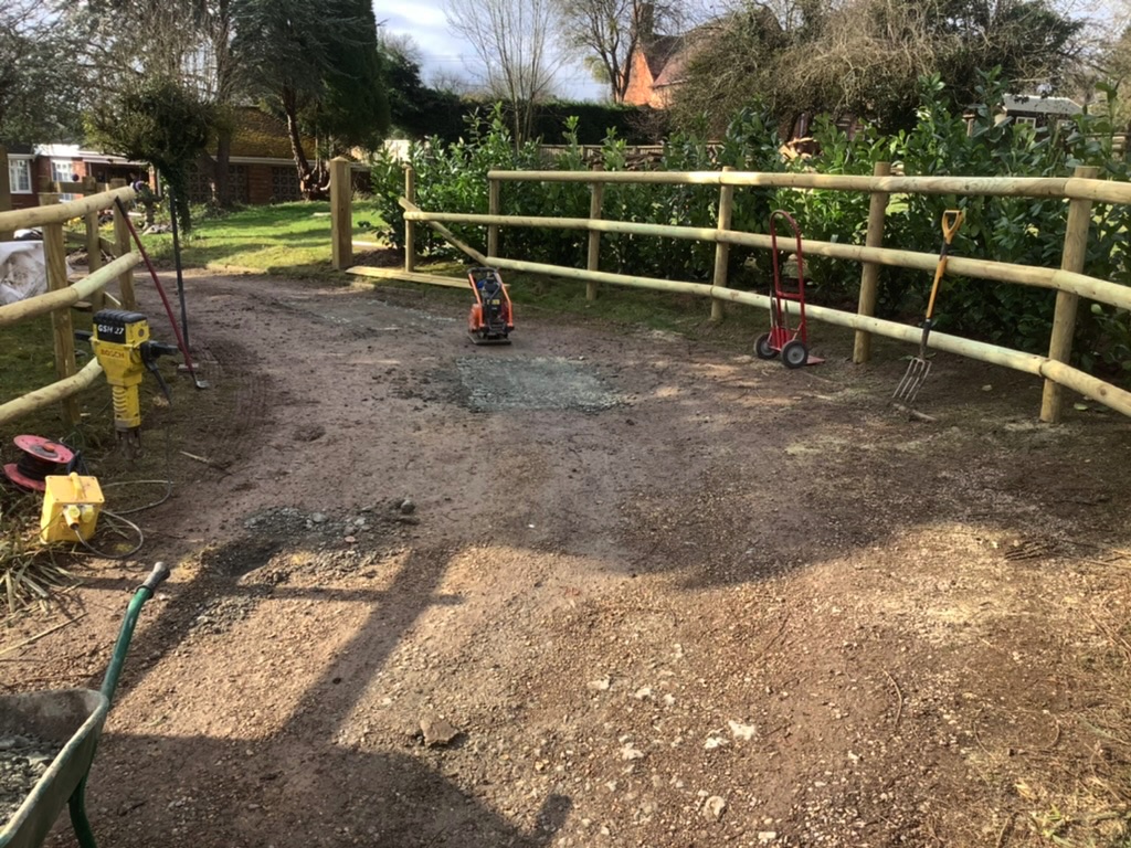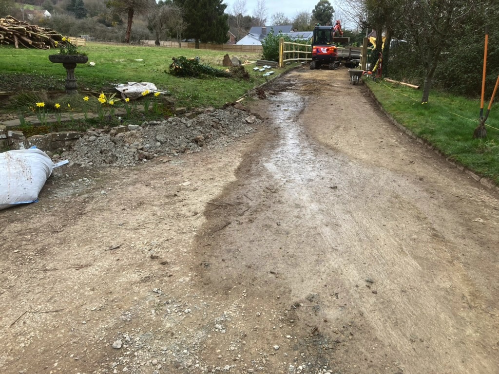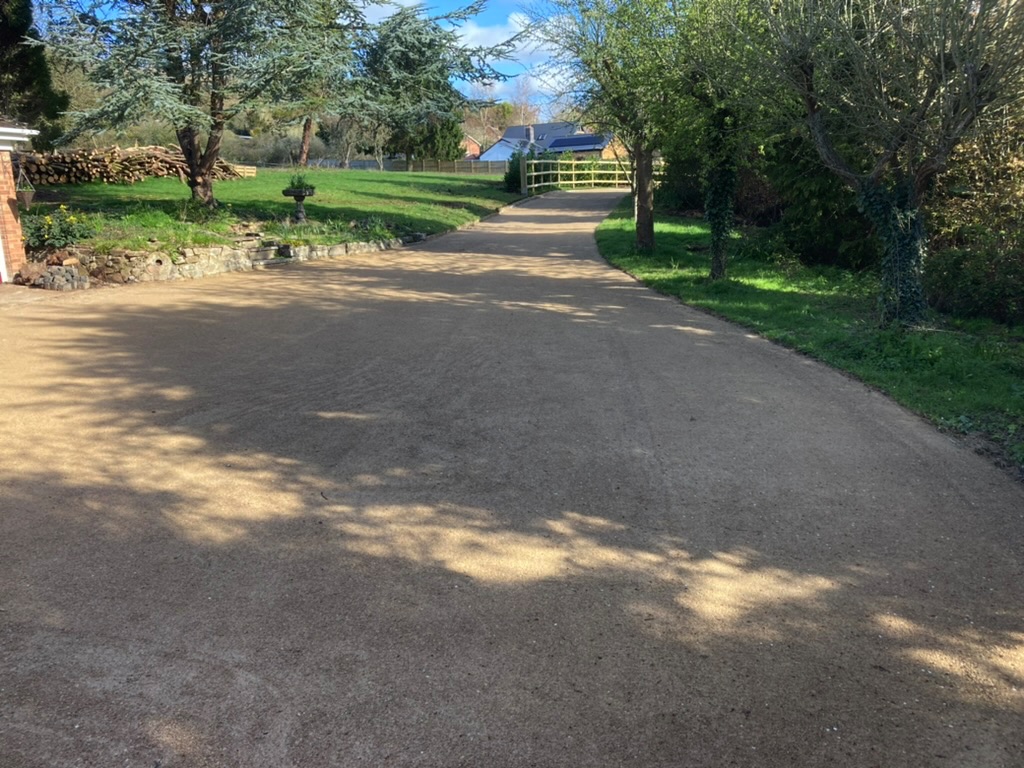 A large driveway that suffered from poor drainage and water erosion. We excavated and then installed extensive drainage and Bredon Self Binding aggregate to form a durable and aesthetically pleasing driveway surface.