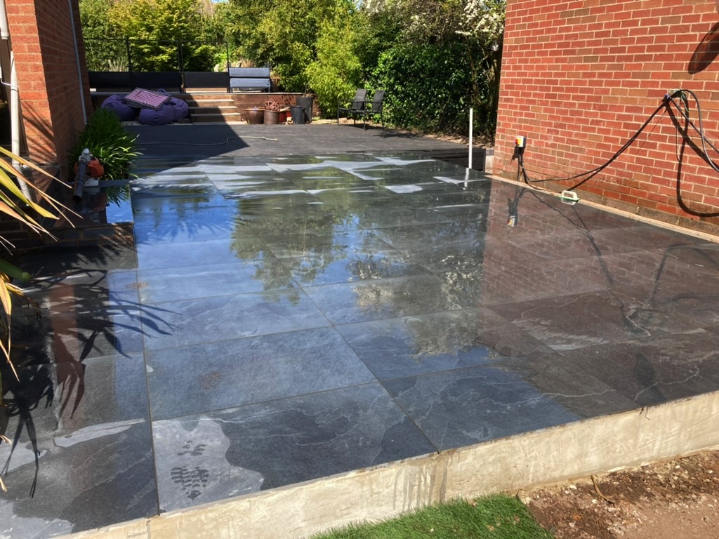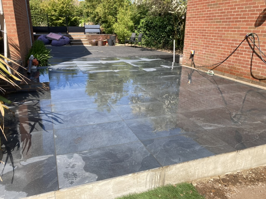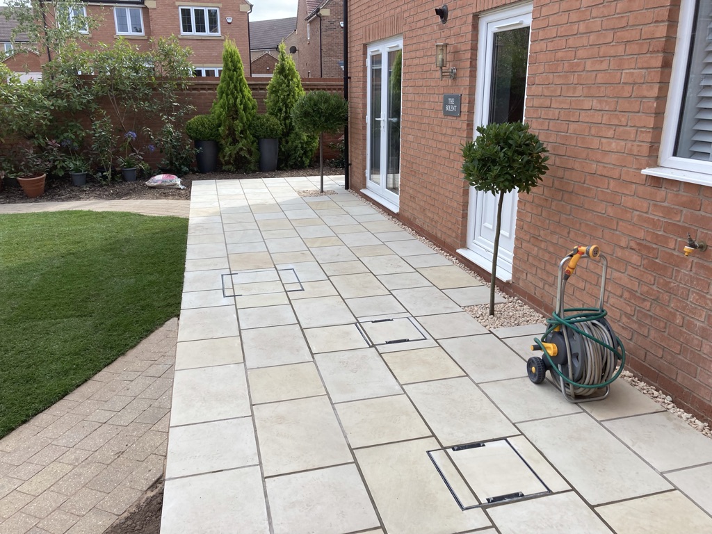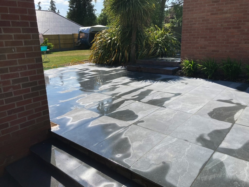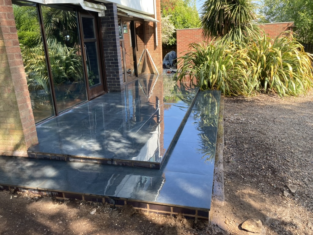 The exisiting paving area needed to be made significantly larger. We utilised the existing slabs by creating a contemporary pattern alongside new, honed Indian sandstone
