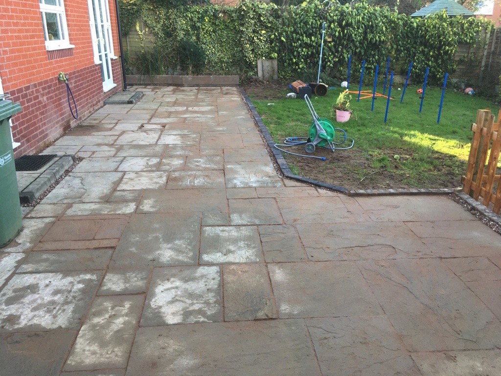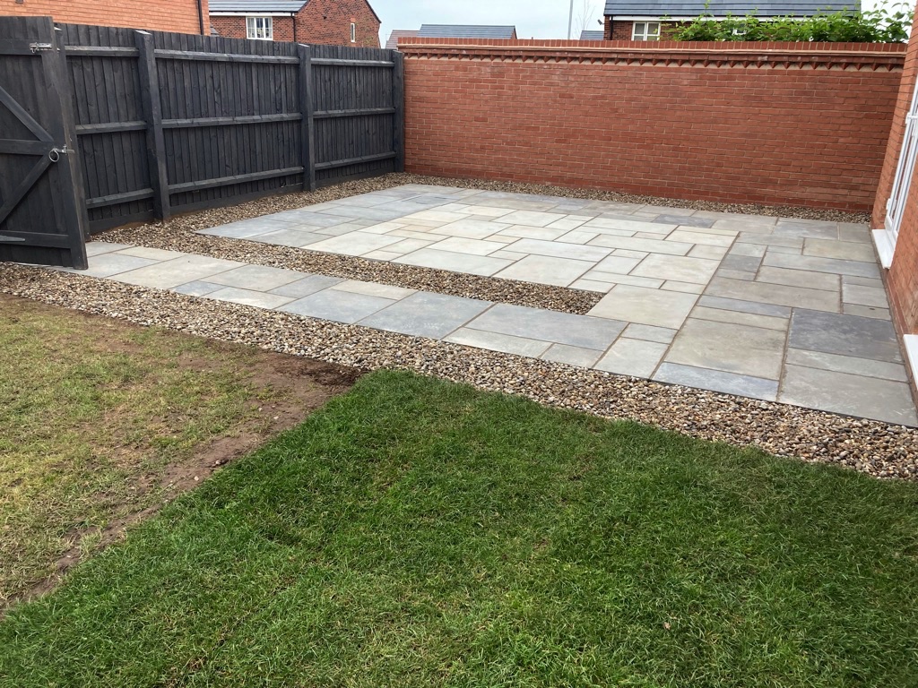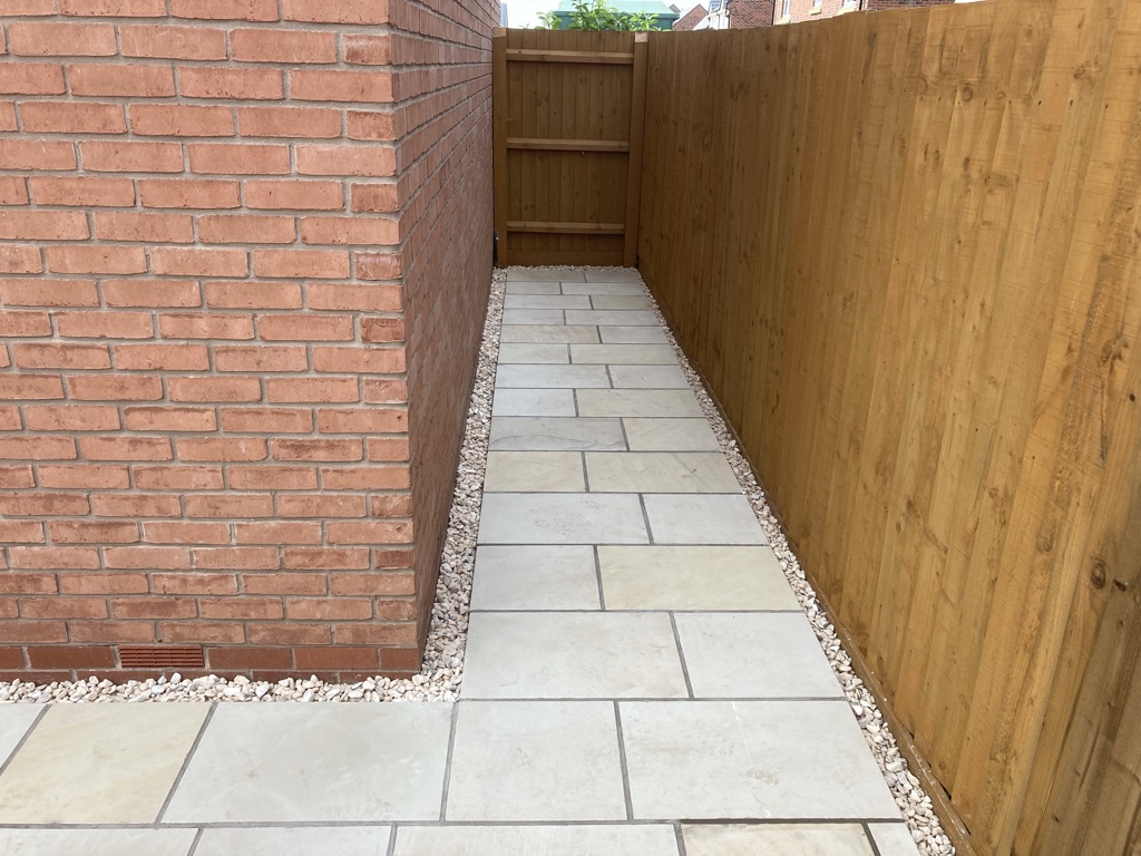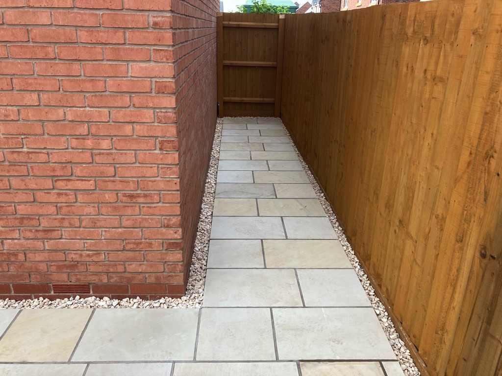 Here we created a large patio area at the rear of the house with a joining path and small hard standing at the side and steps to rear garden All in Indian Sandstone .