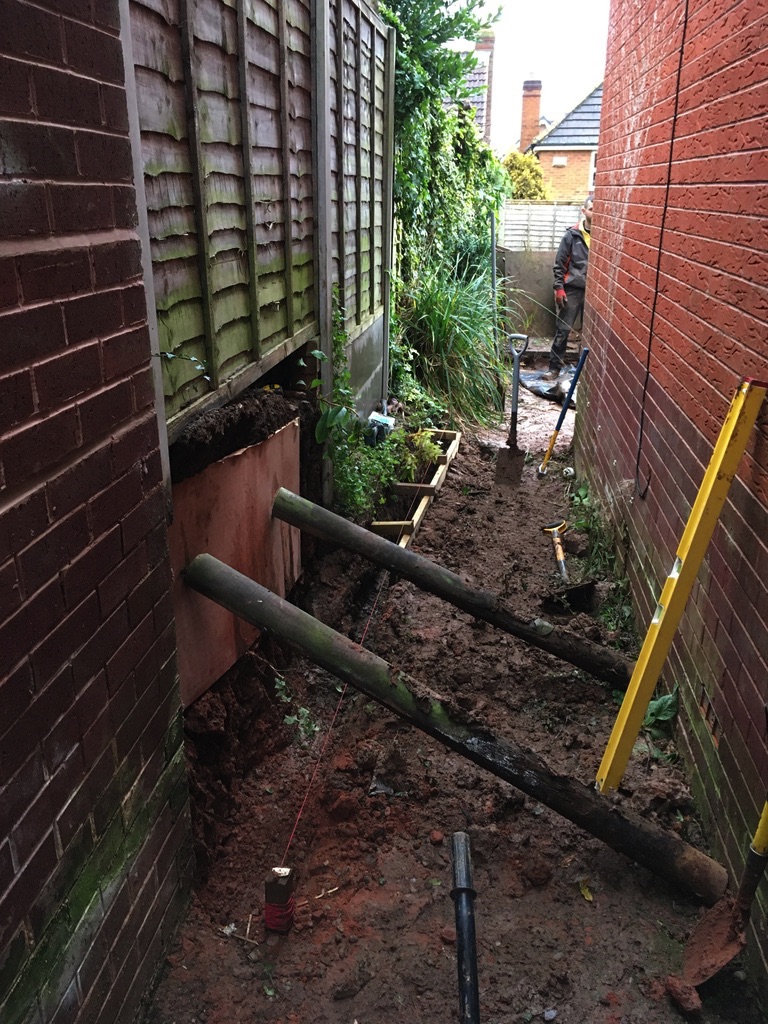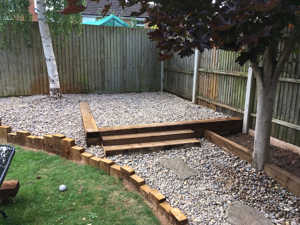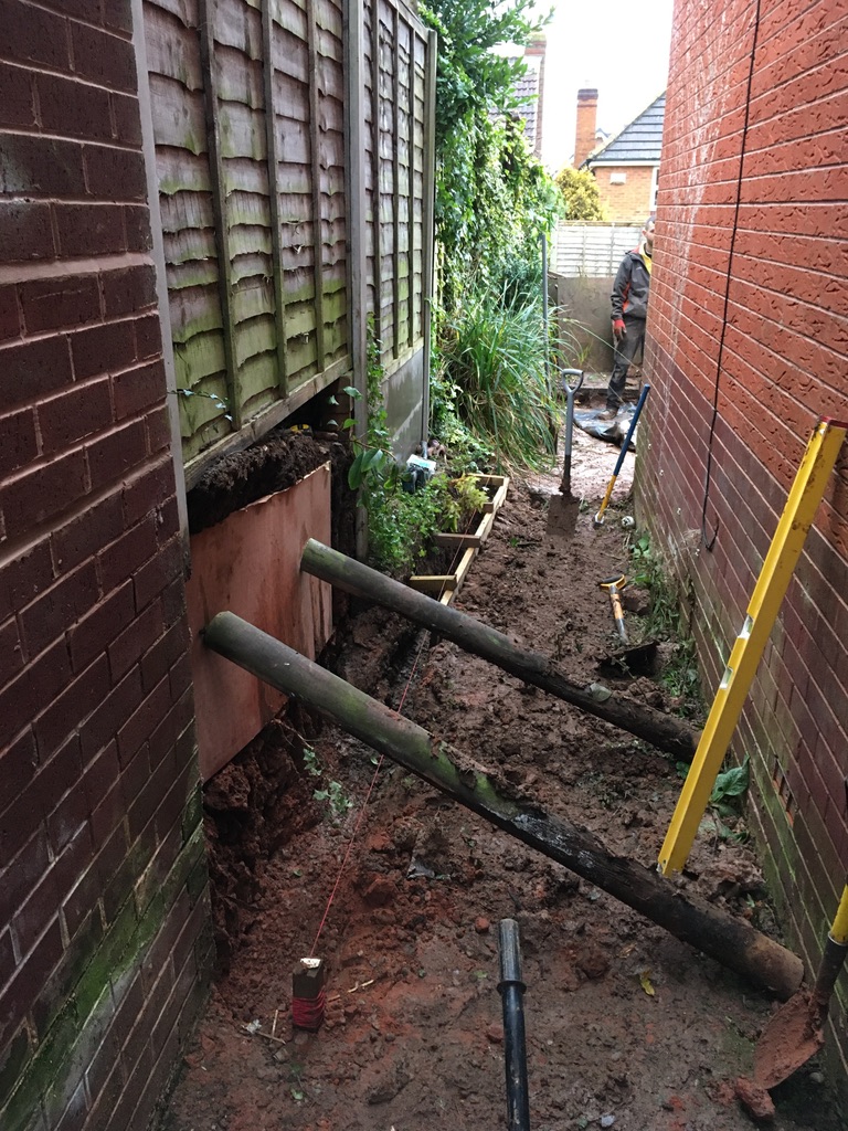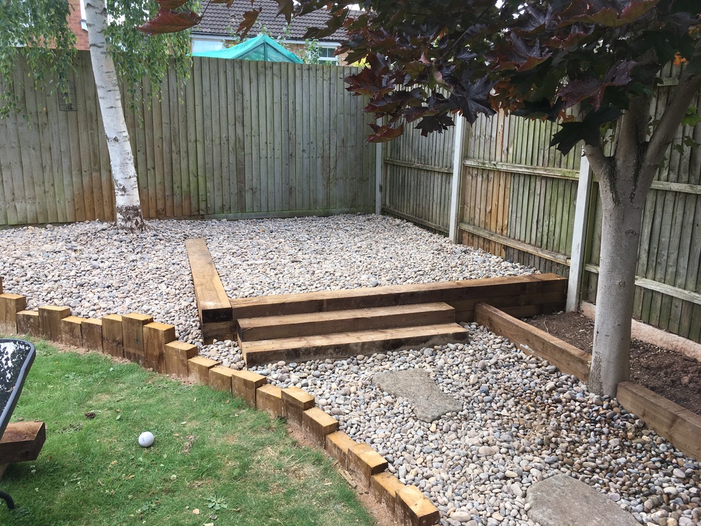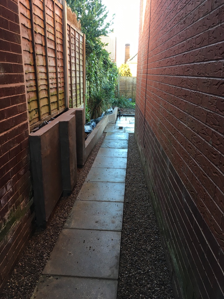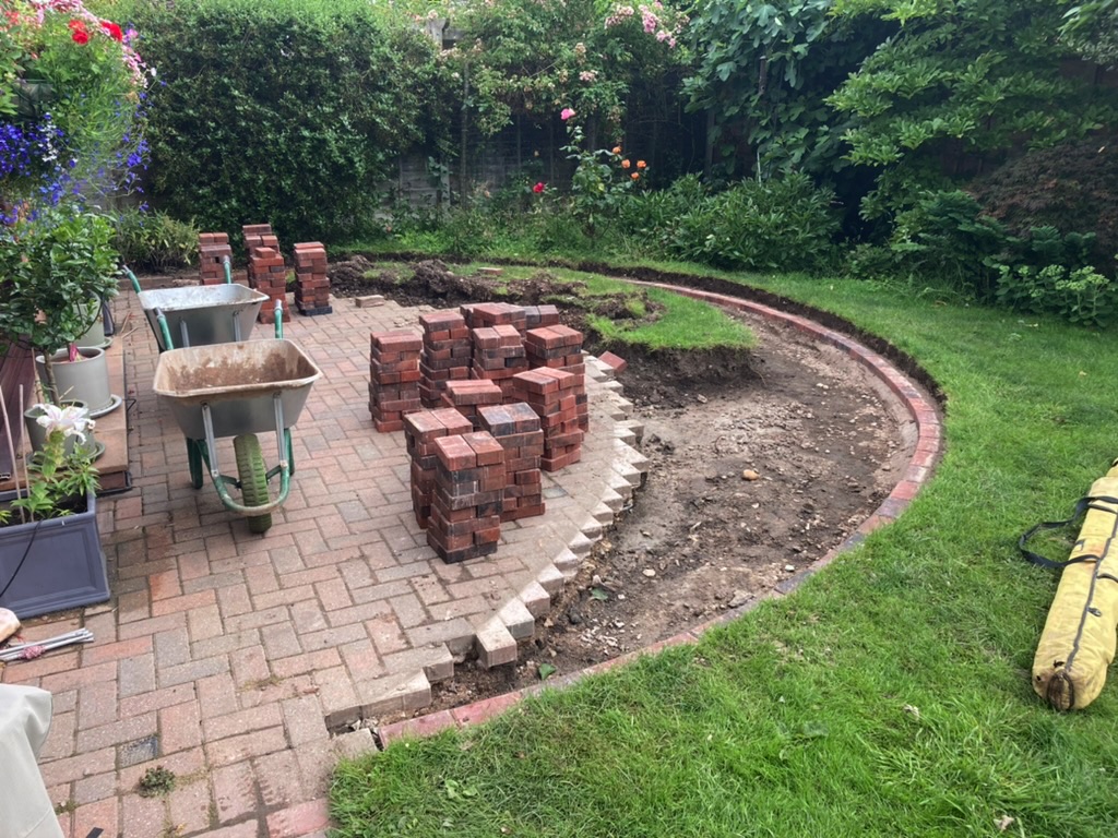 A timber retaining wall that was falling down and a poorly constructed patio were remedied by providing a sound base and footings, block wall and re-laying the patio to industry standards.