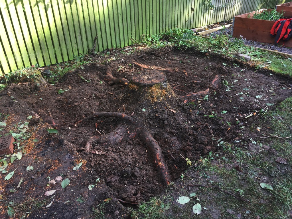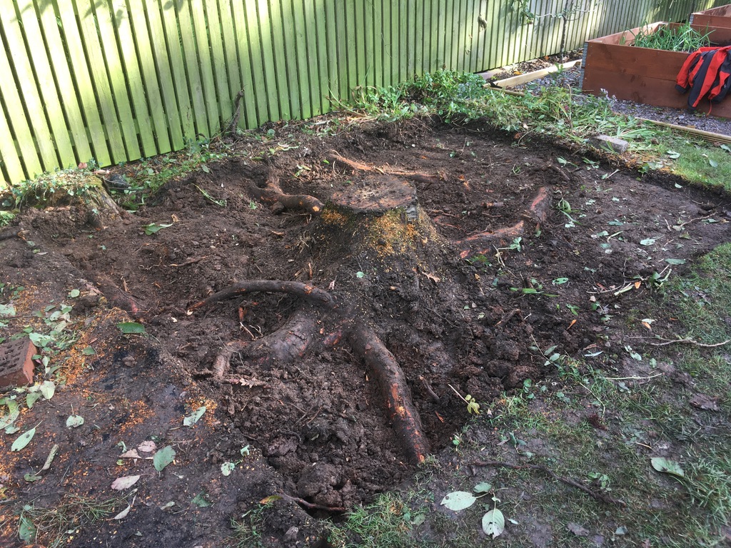 The customer wanted to transform a tired part of the garden into a comfortable area for chairs and a table, in order to enjoy the late day sun. We kept the tree stumps at their request to use as tables/stands which formed a nice feature.