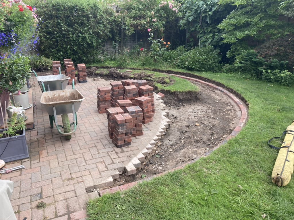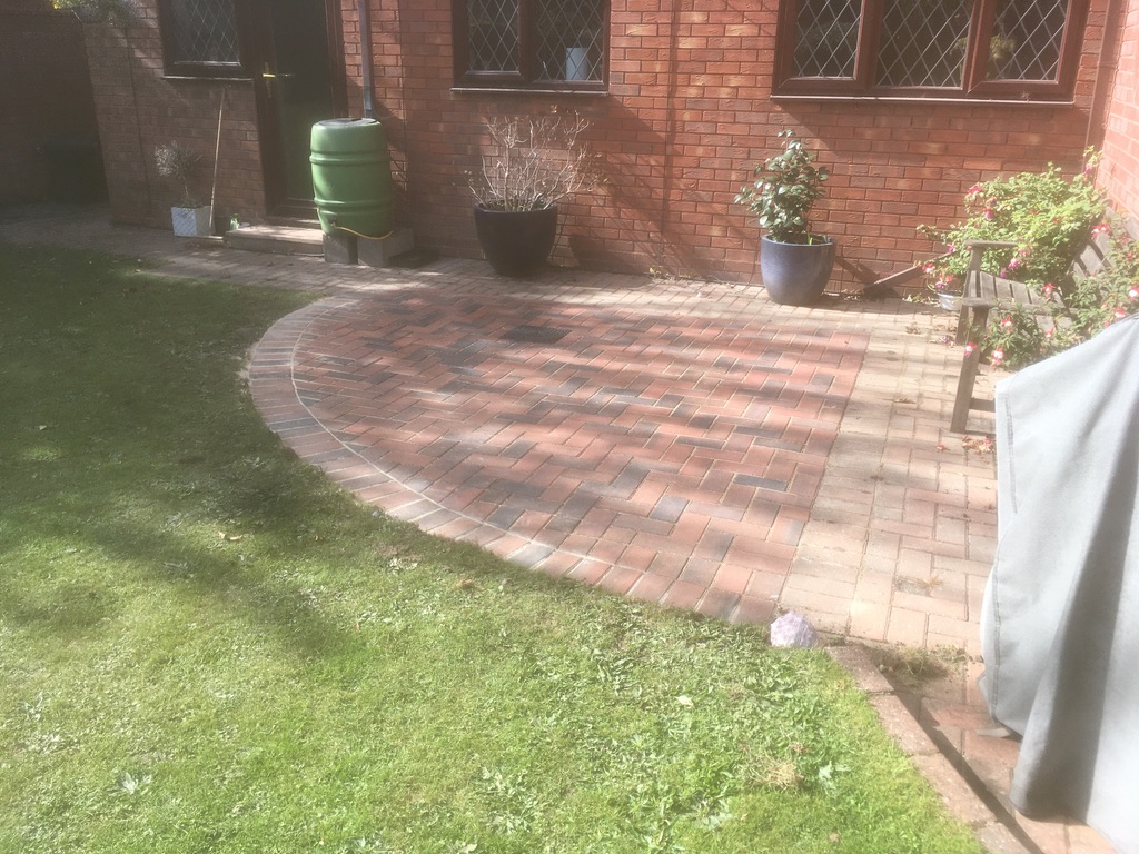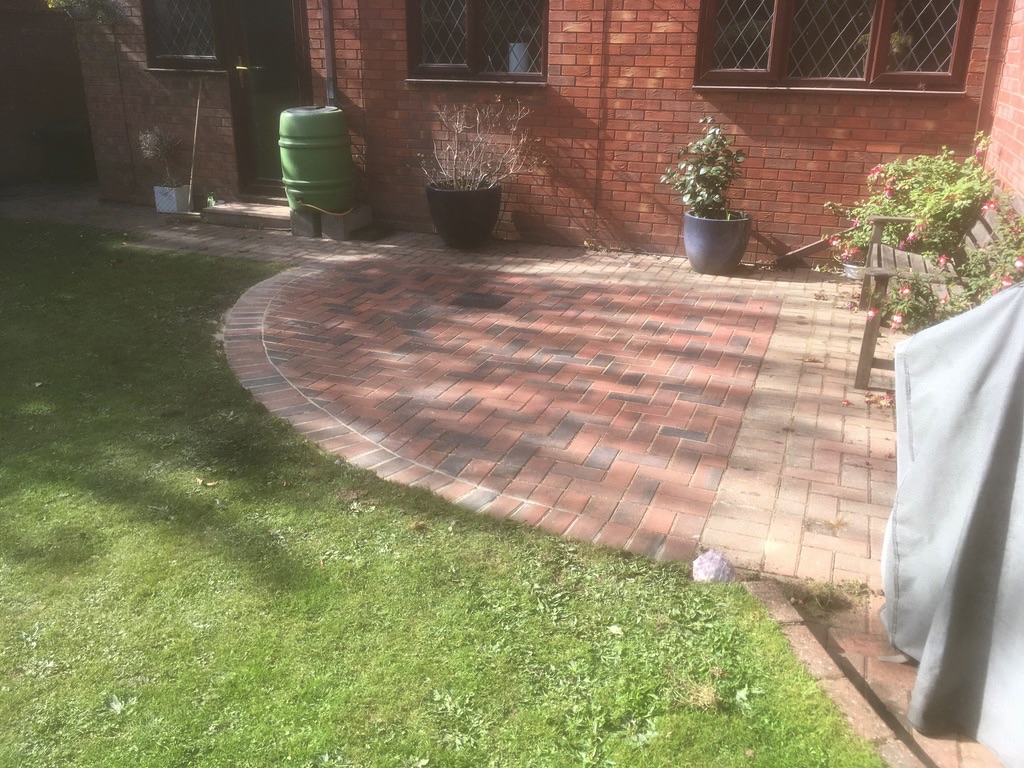 A block paving extension to a semi-circular patio area. The new blocks were a good match but need to weather to completely blend in with time.