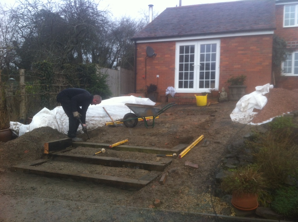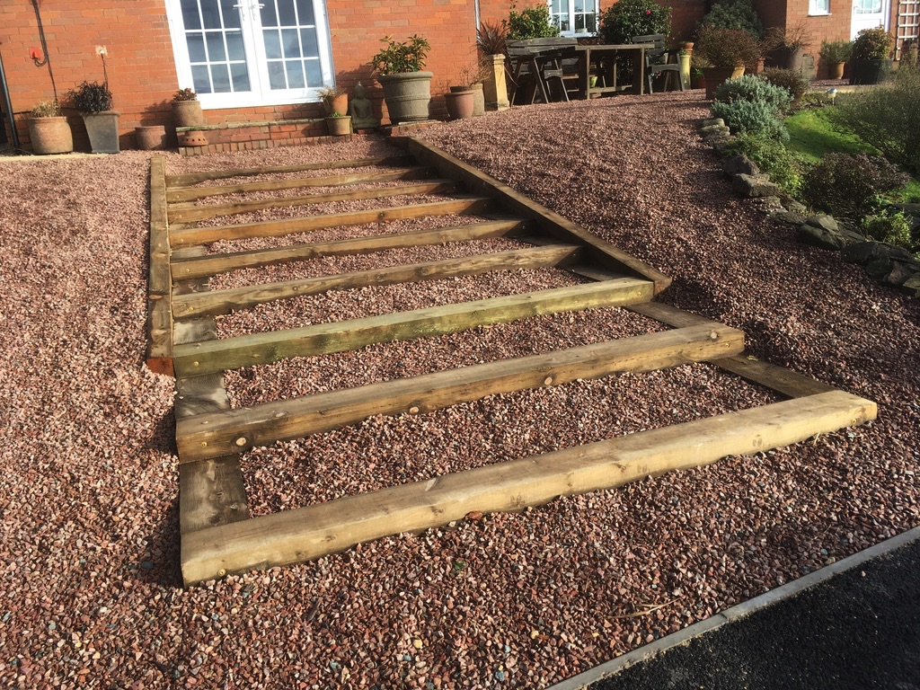 This awkward slope to the house was eased with wide in-filled sleeper steps that created quite a grand entrance