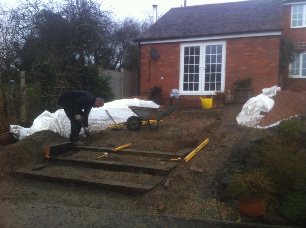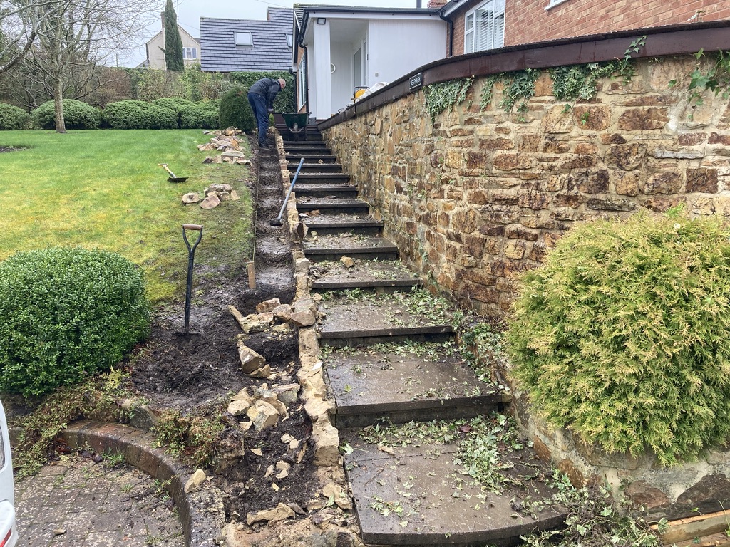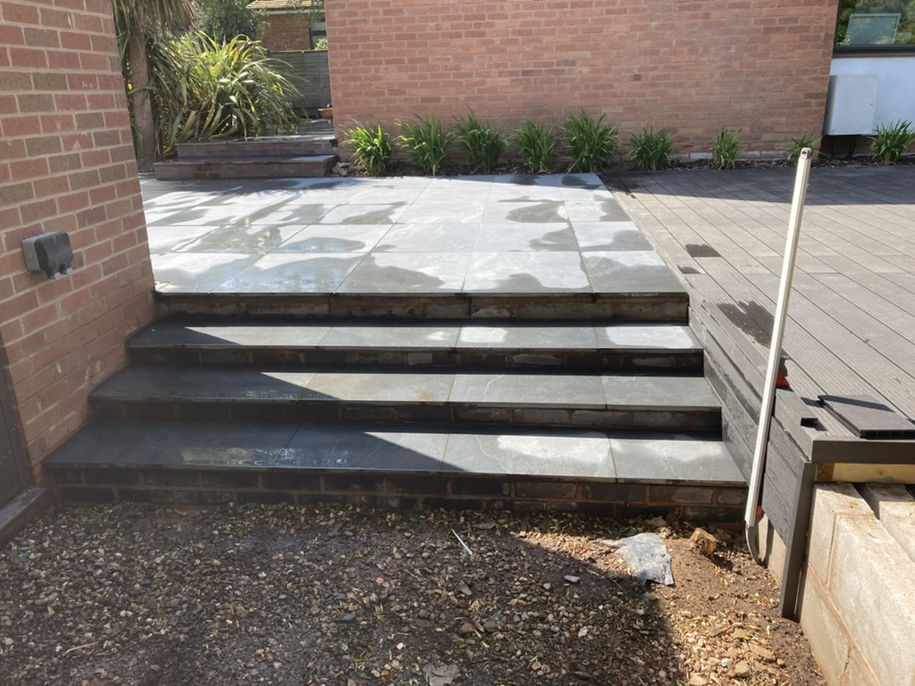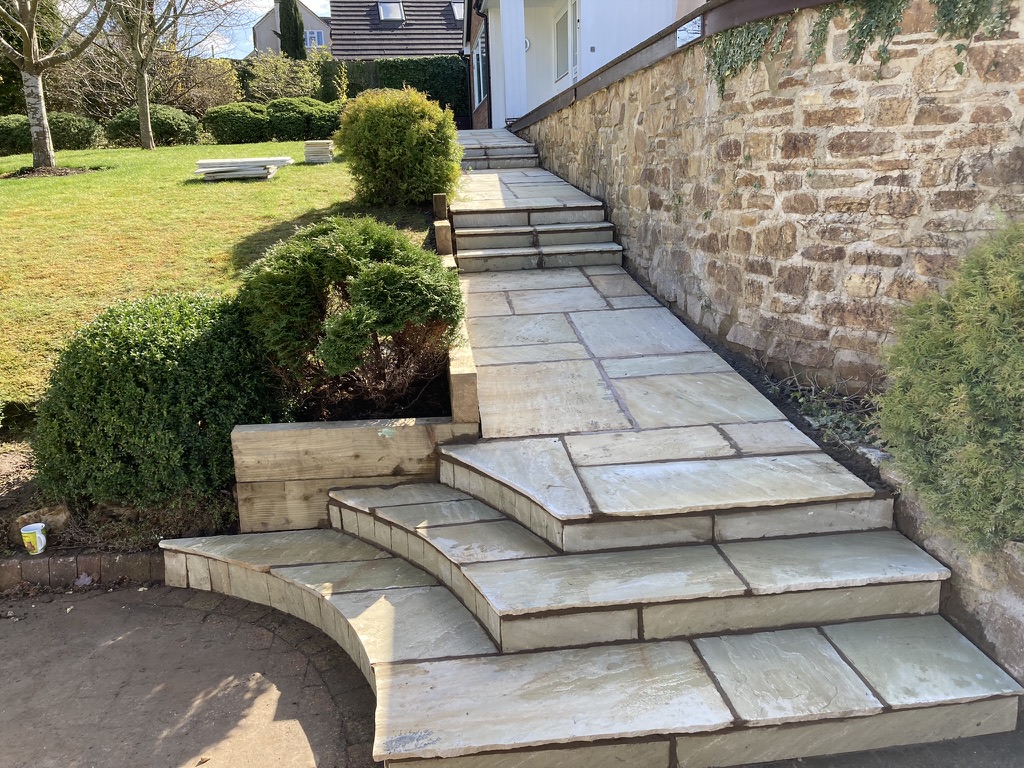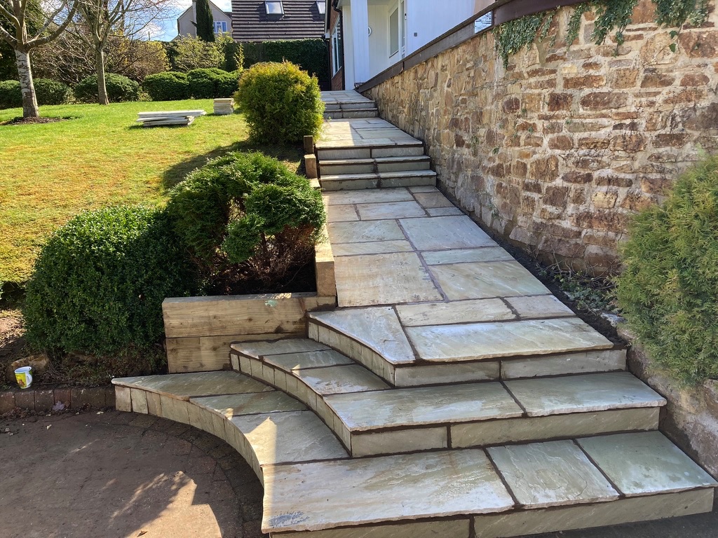 We were asked to build new Indian sandstone steps and slope for this customer whose original steps were at awkward distances and were not an attractive addition to the front of the house. We recalculated the steps into groups with a gentle slope between and also widened them